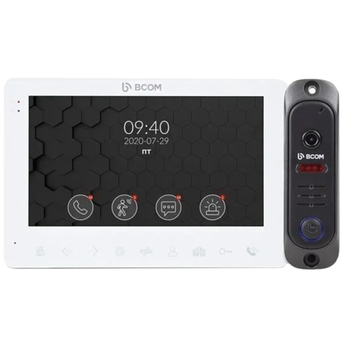 Комплект: видеодомофон и видеопанель. Цветной домофон с TFT экраном 7 дюймов и сенсорными кнопками управления, подключение 2 вызовных панелей, 2 видеокамер, 2 датчиков тревоги. Разговор по громкой связи является интерком. Соединение с вызовной панелью 4-проводное. Слот microSD до 32 Гб, питание 100-240V, потребление 8 Вт. Корпус домофона белого цвета. Цветная панель вызова белого цвета с разрешением 1000ТВЛ и углом обзора 110°, с накладным способом монтажа.