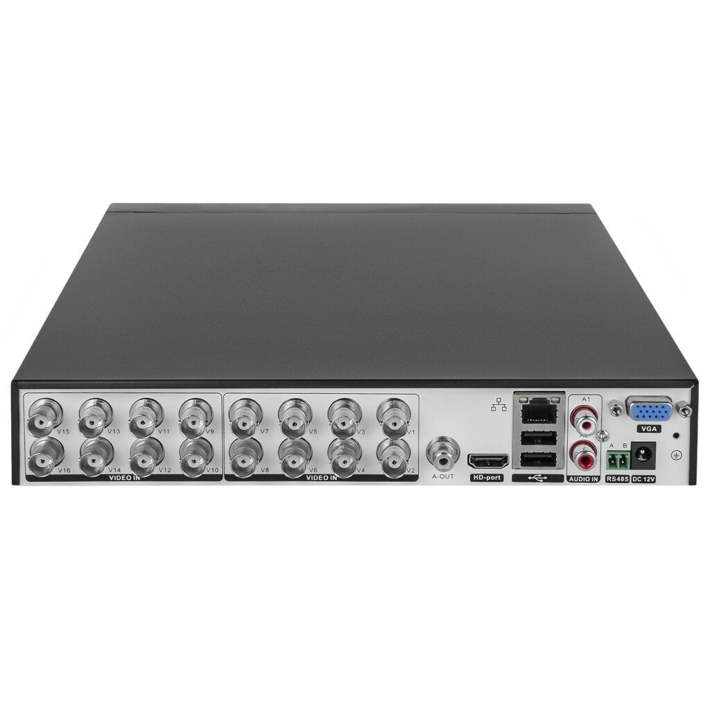 Тип - GHD; Тип поддерживаемых камер - AHD, TVI, CVI, Аналог CVBS, IP; Количество подключаемых камер - 16 шт; Разрешение - 2560x1944; Количество мегапикселей - 1, 1.3, 1.4, 2, 2.1, 2.4, 3, 4, 5; Видеовыход - VGA, HDMI (MAX 4K); Процессор - 00000; Кол-во поддерживаемых HDD - 1 шт; Максимальный объем HDD - 6 ТВ; Сжатие видео - H.264, H.265; Аудиовход - 2 (RCA); Аудиовыход - 1 (RCA); Ethernet LAN - 10/100 Mbit; Управление поворотными камерами - есть; Питание - 12V 2000 mA; Рабочая температура - 0 ~ +55; Материал корпуса - металл.