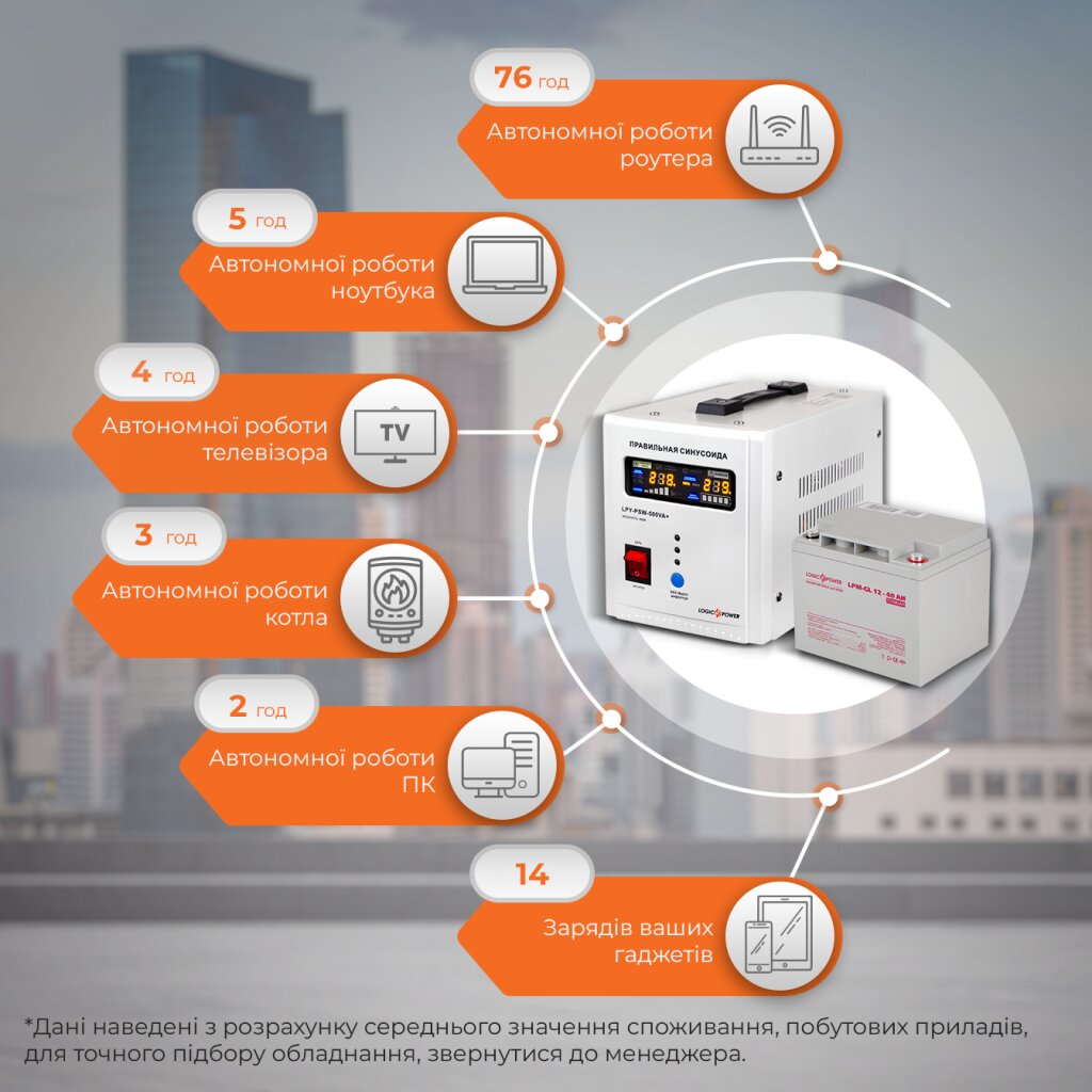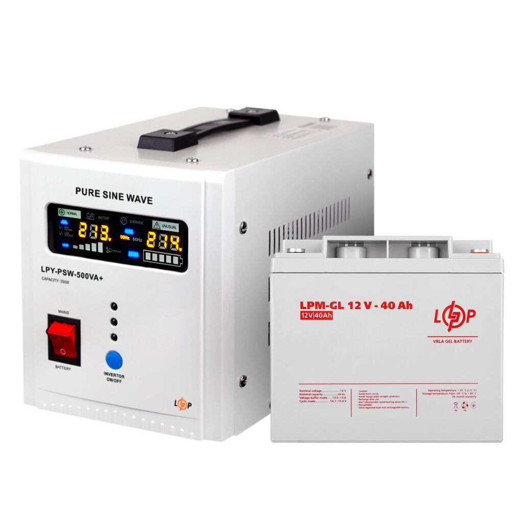 Комплект ИБП Logicpower LPY-PSW-500VA+(350Вт)5A/10A с правильной синусоидой 12В + Аккумулятор гелевый LPM-GL 12V - 40 Ah