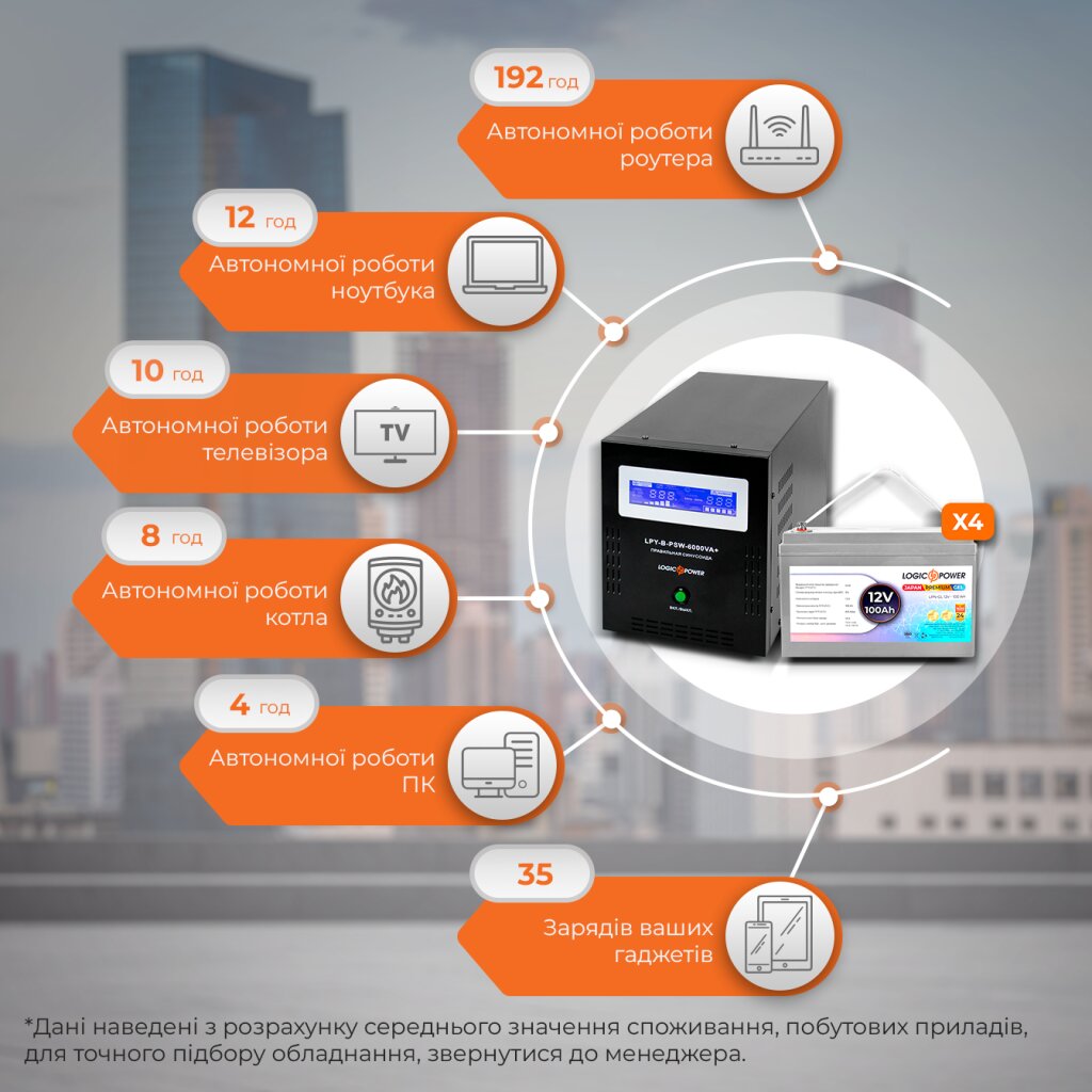 Комплект ИБП LogicPower LPY-B-PSW-6000VA+ (4200Вт) 10A/20A с правильной синусоидой 48V + 4 гелевых аккумулятора LPN-GL 12V - 100 Ah специально подобран для обеспечения бесперебойного питания электрических газовых котлов, систем видеонаблюдения, компьютерной техники и других электрических устройств, которые работают в режиме 24/7/365. ИБП (мощность 6000/4200 VA/W) с правильной синусоидой выполняет функции стабилизатора напряжения (на входе - 140-275V, на выходе - 220±10%V). ИБП и аккумуляторная батарея надежно защищены от коротких замыканий и перегрузок. LPY-B-PSW-6000VA+ (4200Вт) 10A/20A имеет габаритные размеры 385х220х290 мм. Тип подключения к сети – евровилка, тип подключения нагрузки – евророзетка (2 штуки). На внешней стороне корпуса LСD экран отображает ход работы. Максимальный ток заряда – 10/20А. Аккумуляторная батарея LPN-GL 12V - 100 Ah номинальным напряжением 12V имеет два режима зарядки: буферный (напряжение [Зарядное напряжение буферный режим, V] В) и циклический ([Зарядное напряжение циклический режим, V] В). Максимальный ток заряда – 20А. Предусмотрена защита от избыточного заряда и быстрого разряда. Габаритные размеры - 330х171х220 мм. В комплектацию входят 4 аккумуляторные батареи.