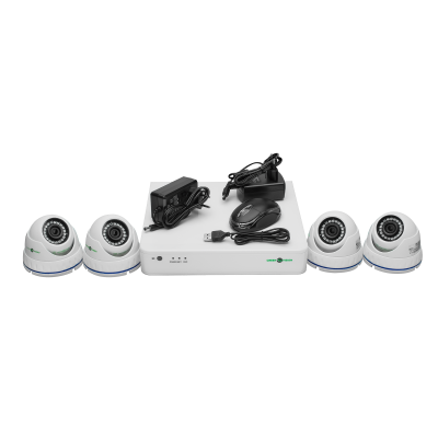 Четыре AHD купольные антивандальные видеокамеры для наружной установки. Объектив с фиксированным фокусом (3.6 мм). Инфракрасная подсветка дальностью 20 метров. Форма корпуса - купол. Материал - пластик. Цвет - белый.