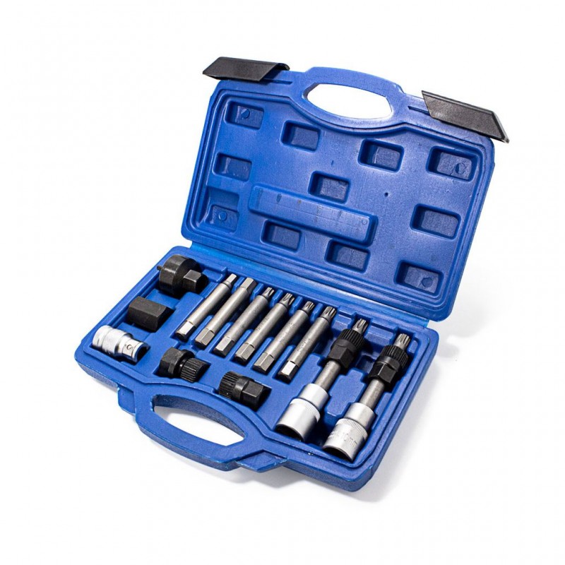 Полный набор инструментов для снятия шкивов свободного хода генераторов переменного тока Bosch и Magneti Marelli. Инструменты для генераторов, подходящие для автомобилей Audi, BMW, Fiat, Ford, Mercedes-Benz, Renault, Seat и Volkswagen.В комплект входят: M10 Spline x 1/2"D, T50 TORX x 1/2"D для генераторов Bosch; Шестигранник 8мм и 10мм; Spline М8 и М10; TORX Т40 и Т50.2 адаптера, подходящих как для генераторов Bosch, так и для генераторов Magneti Marelli, переходник с 1/2 дюйма на шестигранник и 2 разъема для шкивов.В комплекте с футляром для хранения.