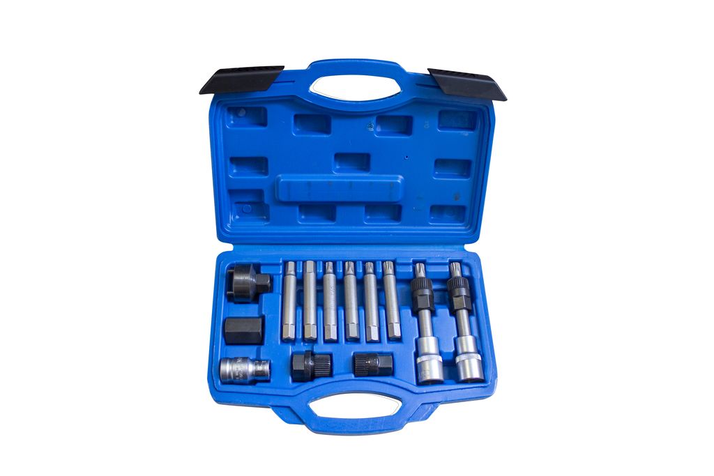Полный набор инструментов для снятия шкивов свободного хода генераторов переменного тока Bosch и Magneti Marelli. Инструменты для генераторов, подходящие для автомобилей Audi, BMW, Fiat, Ford, Mercedes-Benz, Renault, Seat и Volkswagen.В комплект входят: M10 Spline x 1/2"D, T50 Star* x 1/2"D для генераторов Bosch; Шестигранник 8мм и 10мм; Шлицы М8 и М10; Звезда* Т40 и Т50.2 адаптера, подходящие для генераторов Bosch и Magneti Marelli, переходник с 1/2 дюйма D на шестигранник и 2 головки для шкивов.В комплекте с футляром для хранения.