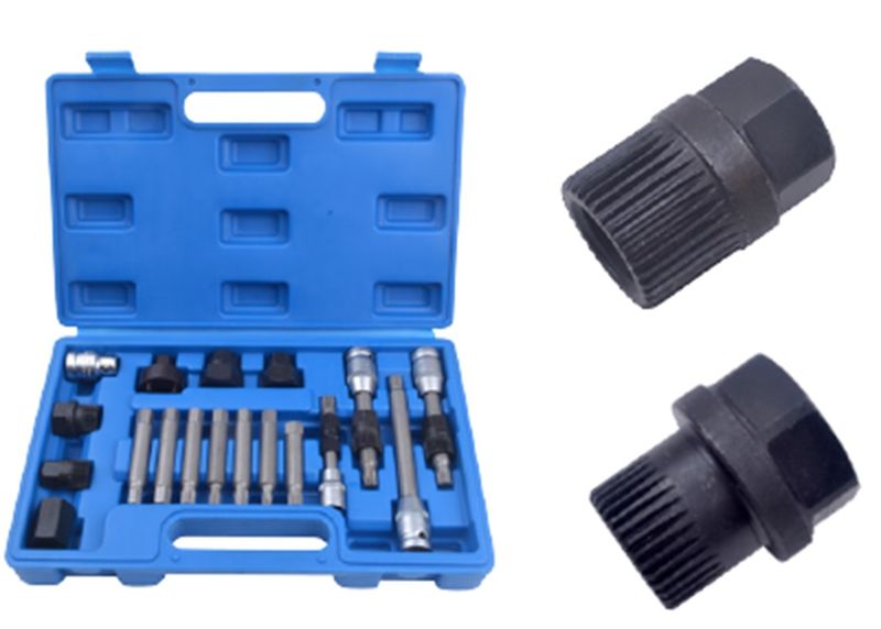 Код товара: 17075, Состав: Набор для снятия шкивов генераторов RF-922G3: 18пр,в кейсе. ROCKFORCE Снимает и устанавливает вспомогательные шкивы с нажимным ременным приводом. Работает с ручным инструментом или ударным гайковертом. Сменные компоненты для работы на VW, Audi, Seat, Mercedes, Renault, BMW, Renault, Fiat и т. д. Содержание:3 комбинированных головки для генератора; Головка T50 x 113 мм / Головка M10 x 113 мм / 3/8 дюйма, M10 x 80 мм Д, Ø14x33TБитовая головка M10x140ммLЗубчатые вставки: 15 мм HEX x 33 зуба и 22 мм HEX x 33 зуба22-мм шестигранная головкаШестигранная головка 22x28 мм Шестигранная головка 19x28 мм35-мм круглая розетка с 4 контактамиАдаптер для бит 1/2” Dr SQ.(F) x 10 мм Hex.(F)Бит M10 x H12 x 64L10 мм (шестигранный хвостовик) x 75 мм L CR-V бит: T40 / T50 / M8 / M10 / H8 / H10