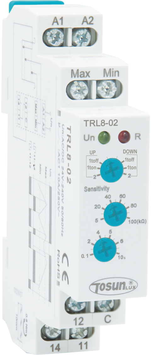 Реле контроля уровня жидкости TRL8-02, AC/DC 24-240В, 10А, уровни контроля 1/2, чувствительность 5-100кОм, 1SPDT