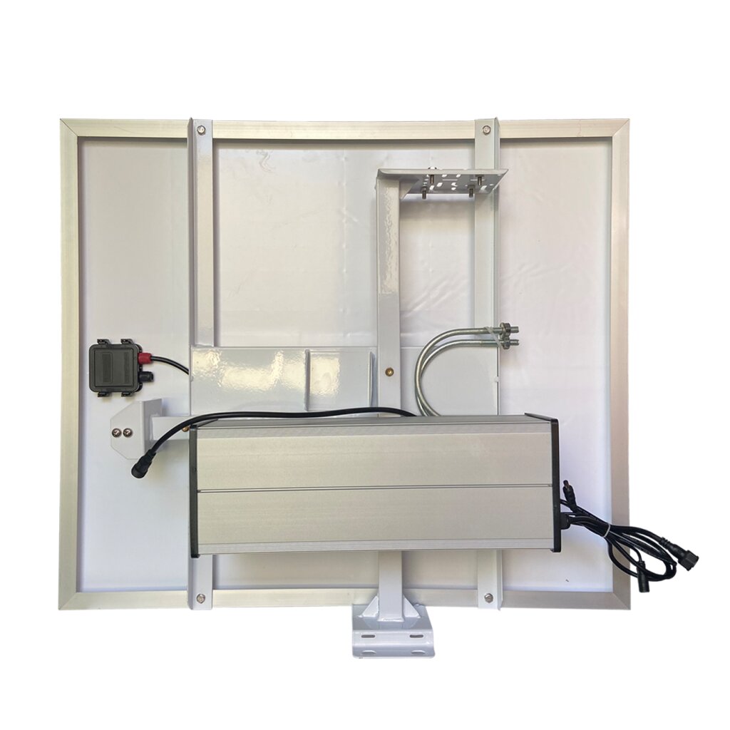 Солнечная батарея мощностью 100W генерирует постоянный ток (12V). Блок питания камеры DC12V расположен непосредственно на кронштейне.