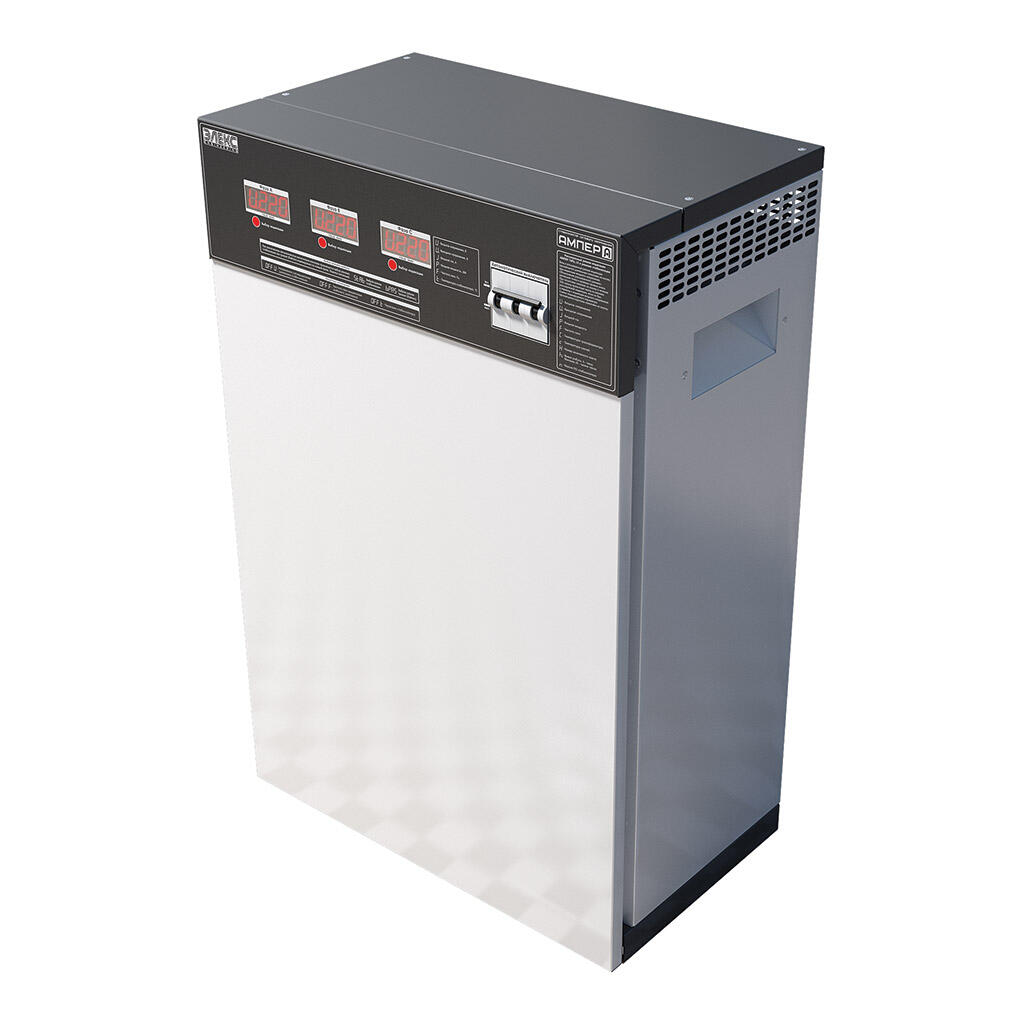 Трехфазный стабилизатор напряжения Ампер У 12-3/25 v2.0 предназначен для работы в трехфазных электрических сетях с колебаниями напряжения от 145 до 275В. В этом диапазоне аппарат гарантированно выдает на выходе напряжение в рамках 220±3,5%, что обеспечивается за счет использования 12 ступеней стабилизации. Общая номинальная мощность данной модели 16.5 кВт (5.5 кВт на фазу), что соответствует рабочему току автоматического выключателя 25А на нем.