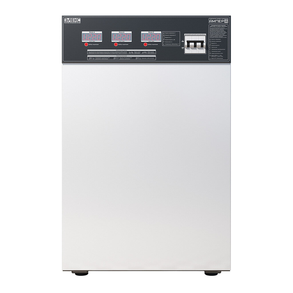 Трехфазный стабилизатор напряжения Ампер У 12-3/32 v2.0 предназначен для работы в трехфазных электрических сетях с колебаниями напряжения от 145 до 275В. В этом диапазоне аппарат гарантированно выдает на выходе напряжение в рамках 220±3,5%, что обеспечивается за счет использования 12 ступеней стабилизации. Общая номинальная мощность данной модели 21 кВт (7 кВт на фазу), что соответствует рабочему току автоматического выключателя 32А на нем.
