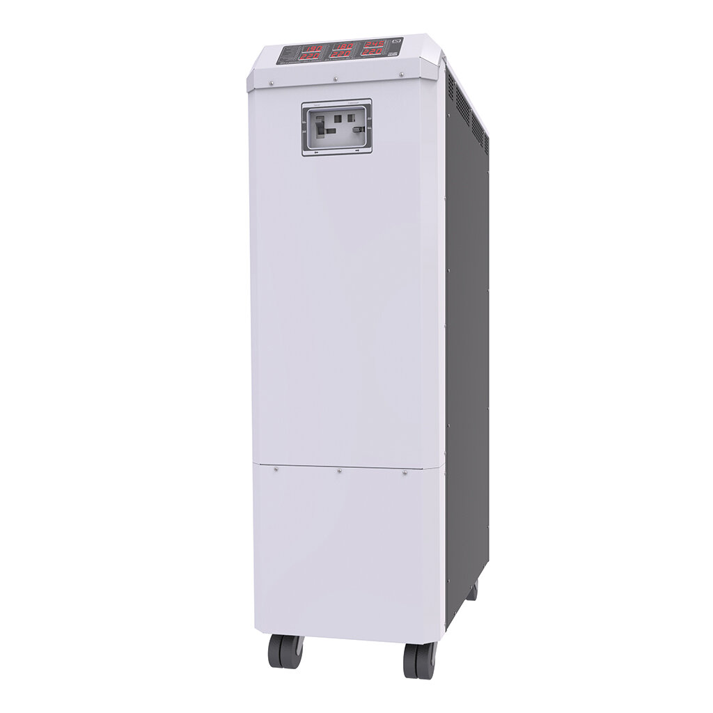 К особенностям данного стабилизатора можно отнести двойной LED-индикатор на фазу, линейная полоса загрузки, наличие механического транзита (байпас), напольное исполнение, наличие входных и выходных фильтров для защиты от высокочастотных помех, бесшумную работу за счет использования тороидальных трансформаторов и тиристорных ключей.