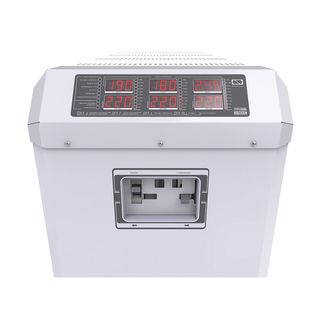 К особенностям данного стабилизатора можно отнести двойной LED-индикатор на фазу, линейная полоса загрузки, наличие механического транзита (байпас), напольное исполнение, наличие входных и выходных фильтров для защиты от высокочастотных помех, бесшумную работу за счет использования тороидальных трансформаторов и тиристорных ключей.
