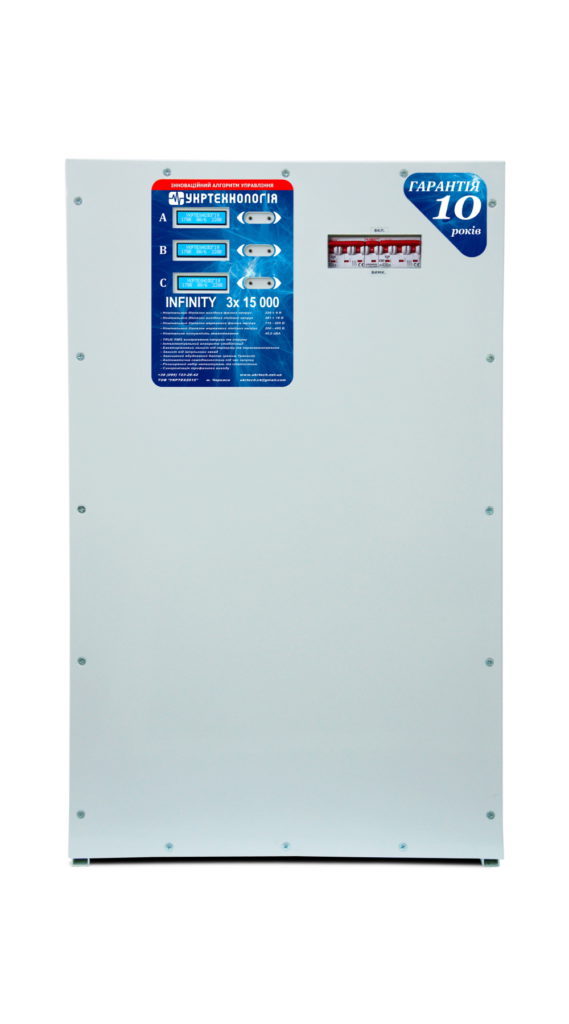 Стабилизатор напряжения трехфазный состоит из трех независимых стабилизаторов НСН собранных и коммутируемых в одном корпусе. Конструктивно стабилизатор выполнен в металлическом корпусе, позволяющем эксплуатировать его в напольном варианте. На лицевой панели расположены ЖК индикаторы, показывающие (по умолчанию) уровень входного и выходного напряжений, ток и номер ступени.
