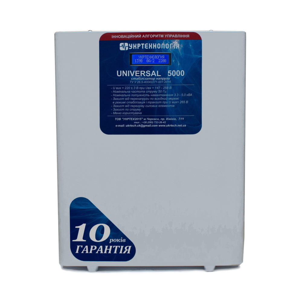 • Вес: 18 кг Основные технические характеристики стабилизаторов Universal: • Автоматическое отключение от сети при повышенном входном напряжении.